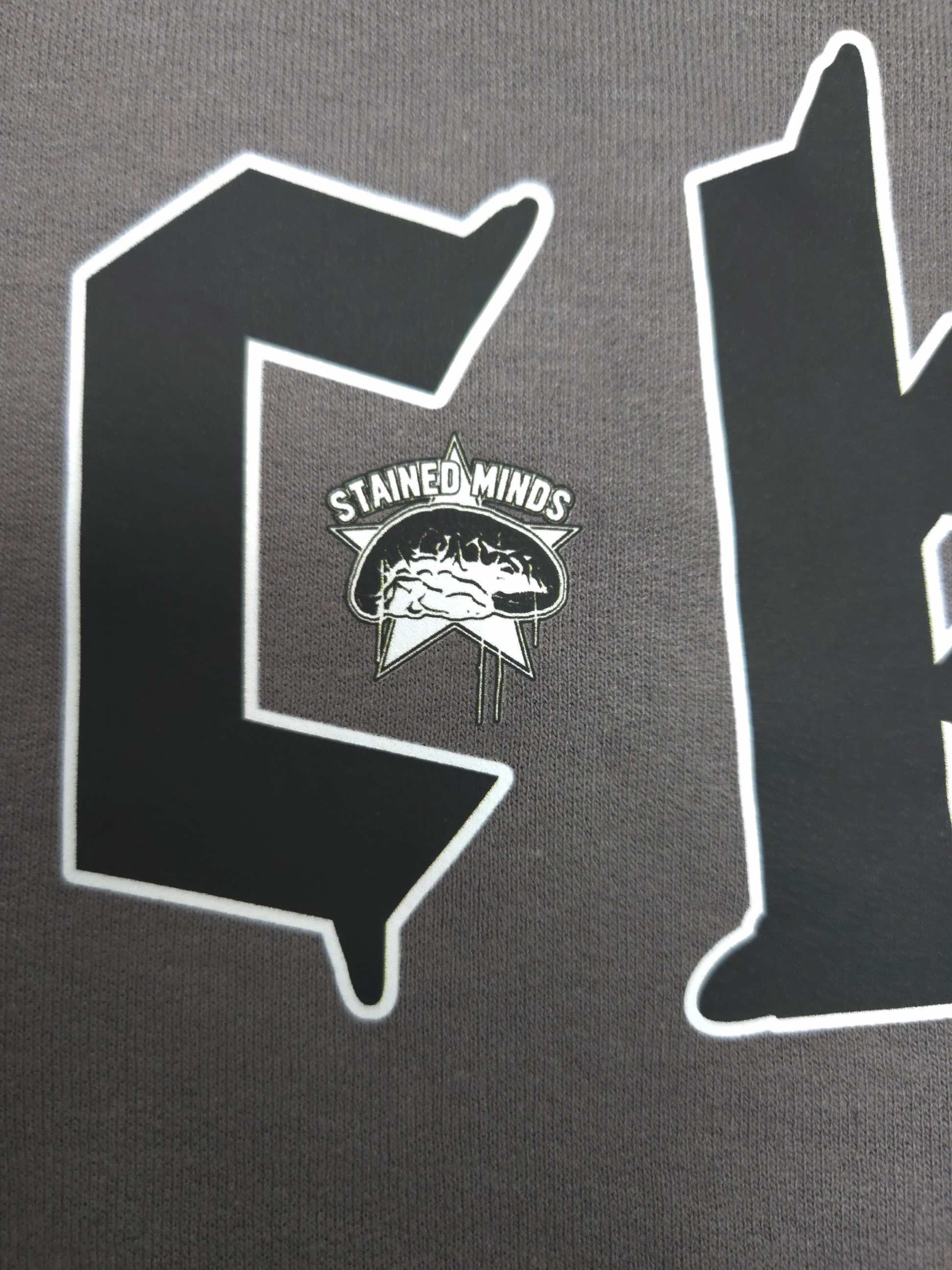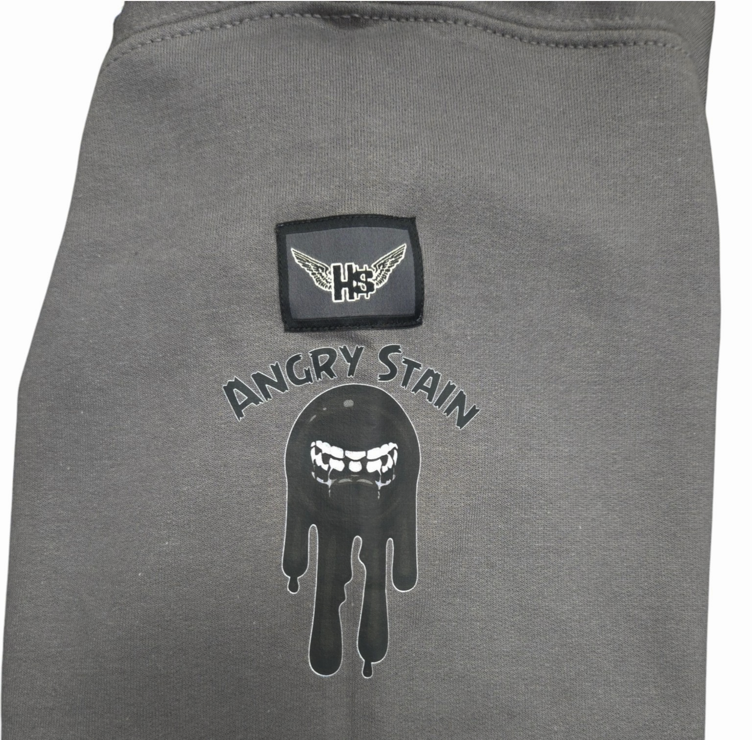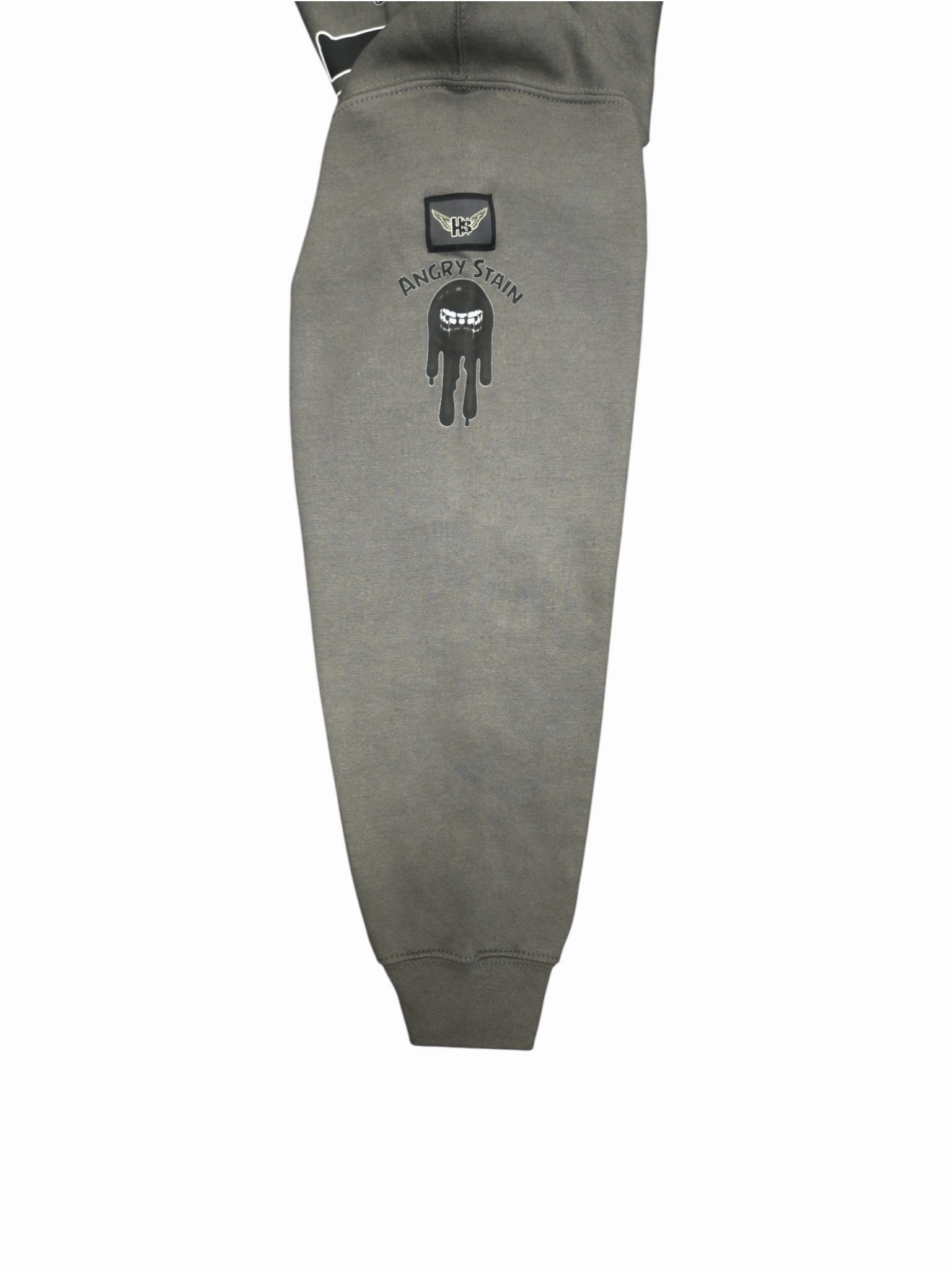 Left sleeve: Black and white Angry Stain graphic.